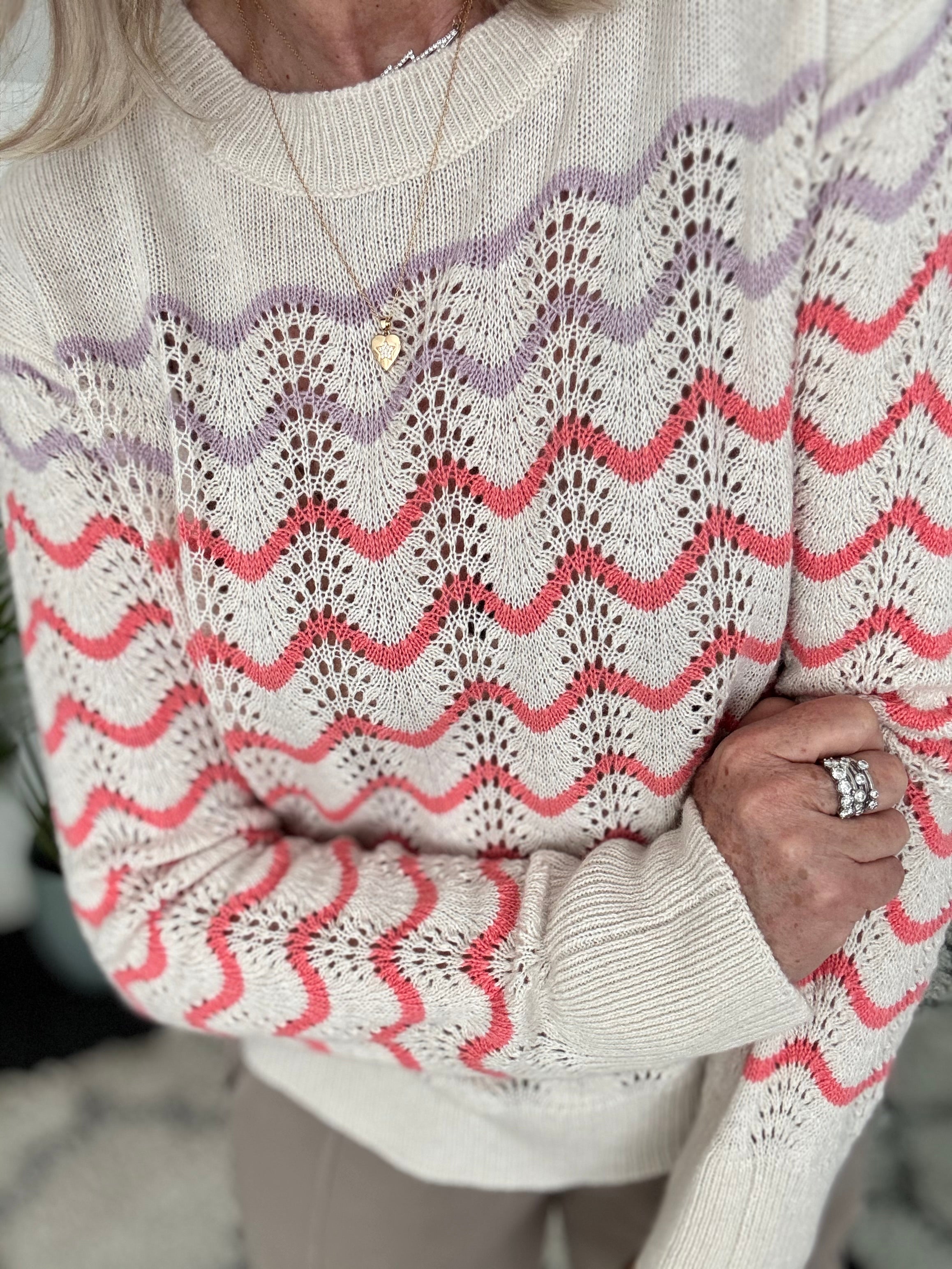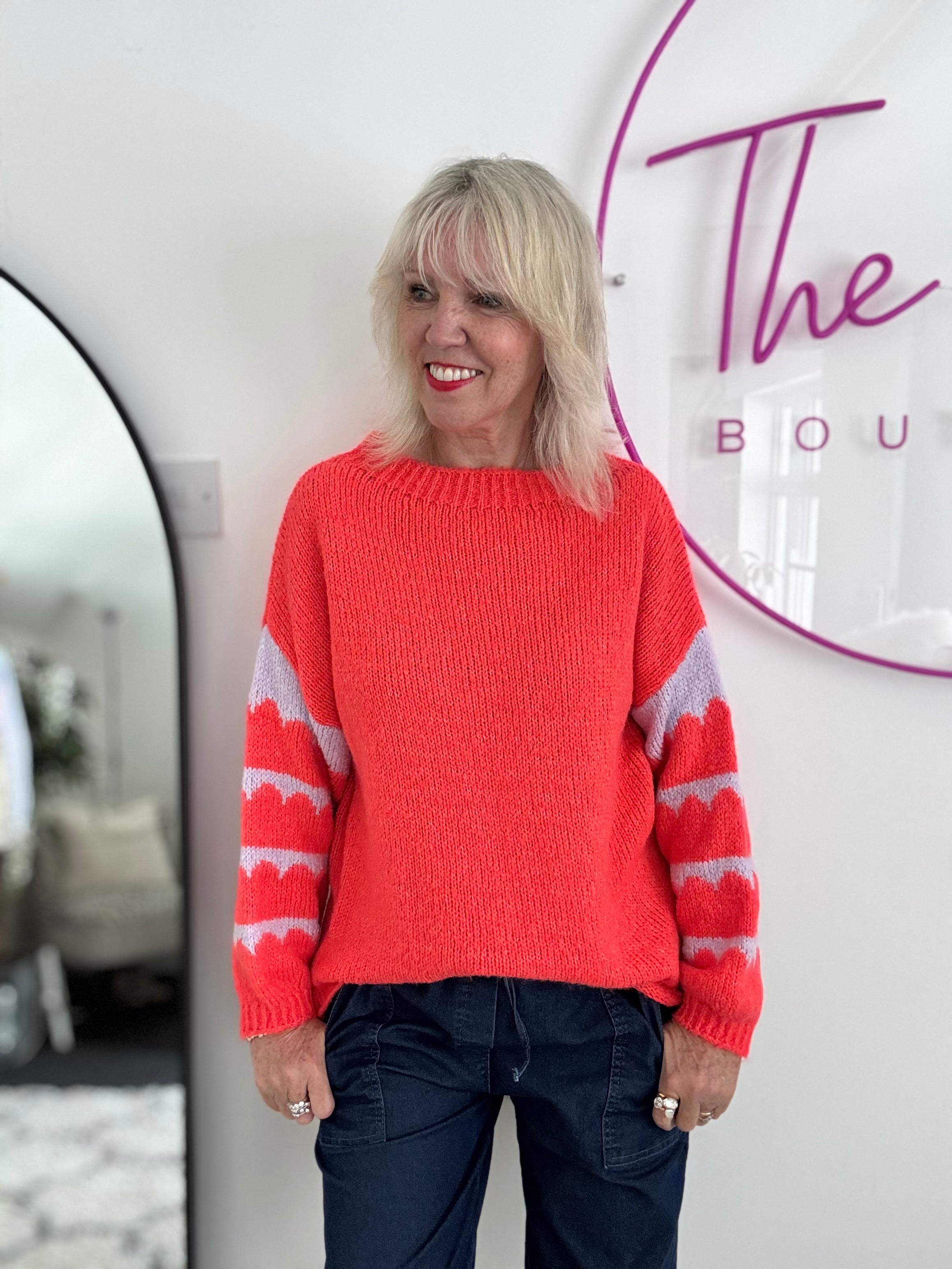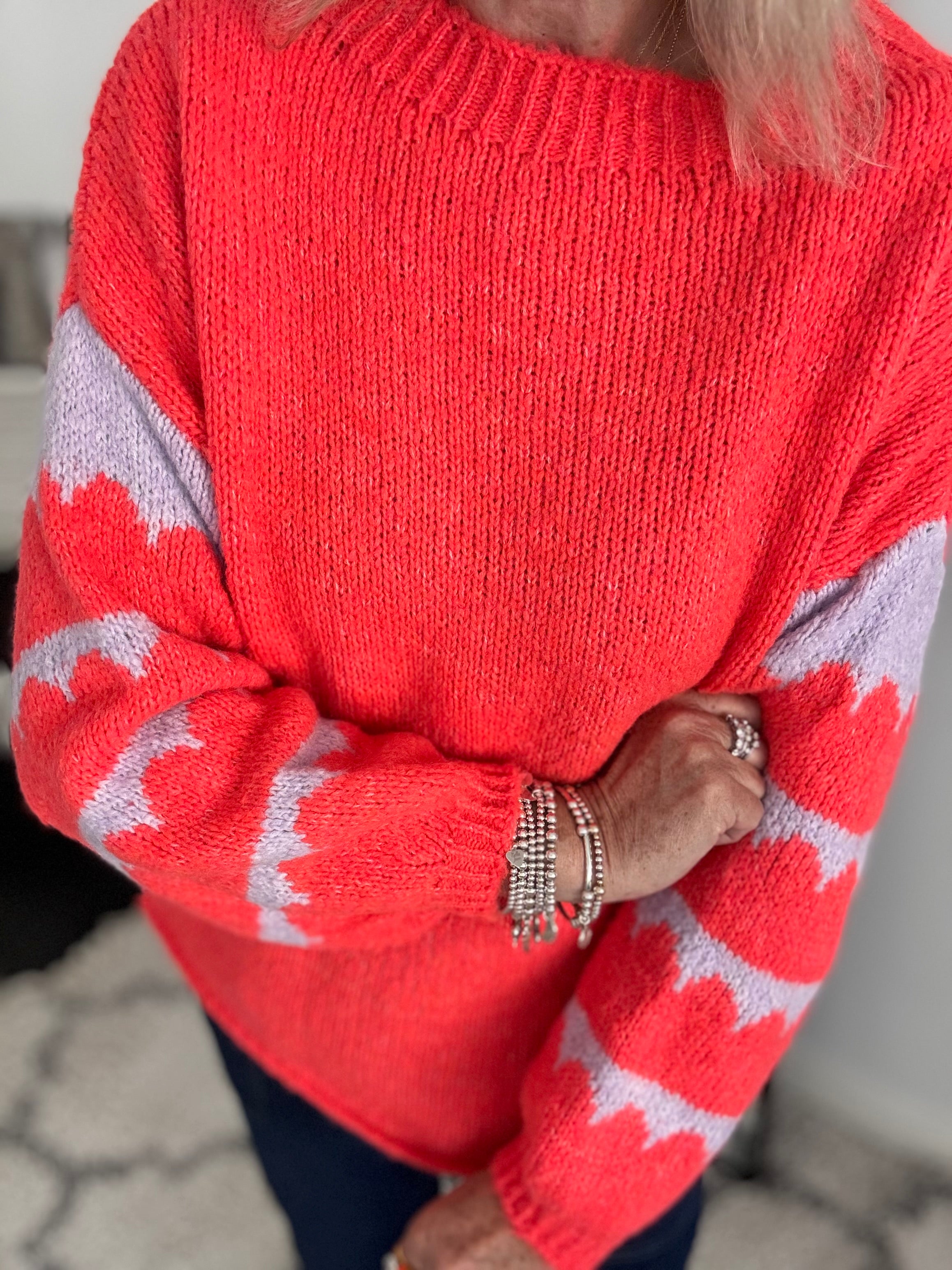 Coral Jumper with Stripe Lilac Sleeves