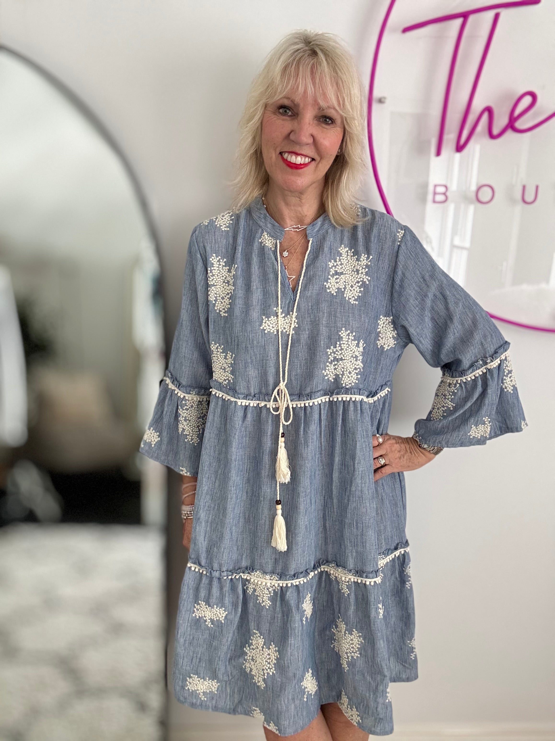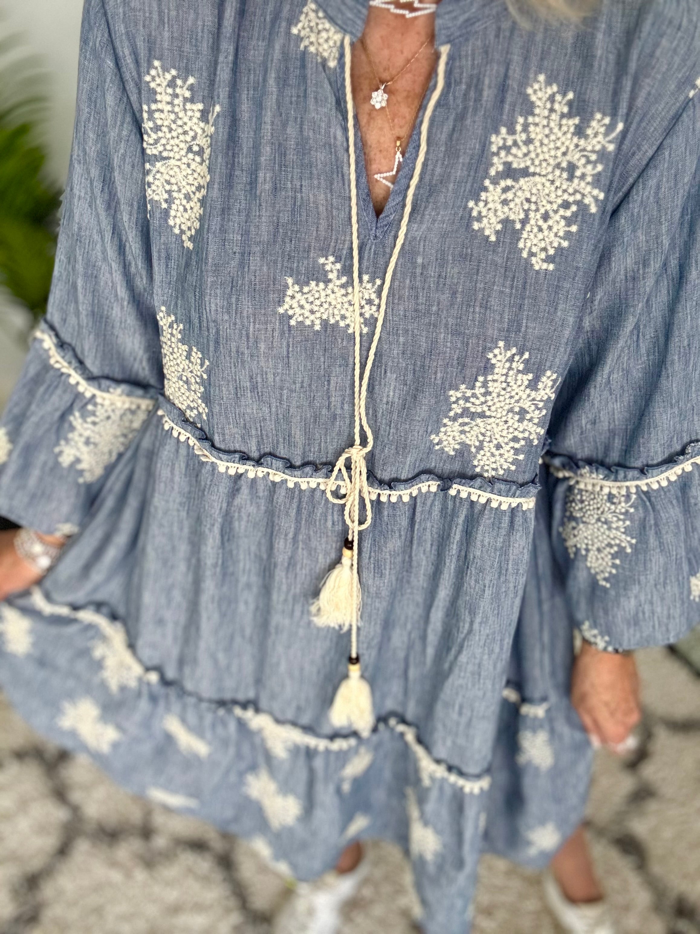 Embroidered Tiered Dress in Blue & White