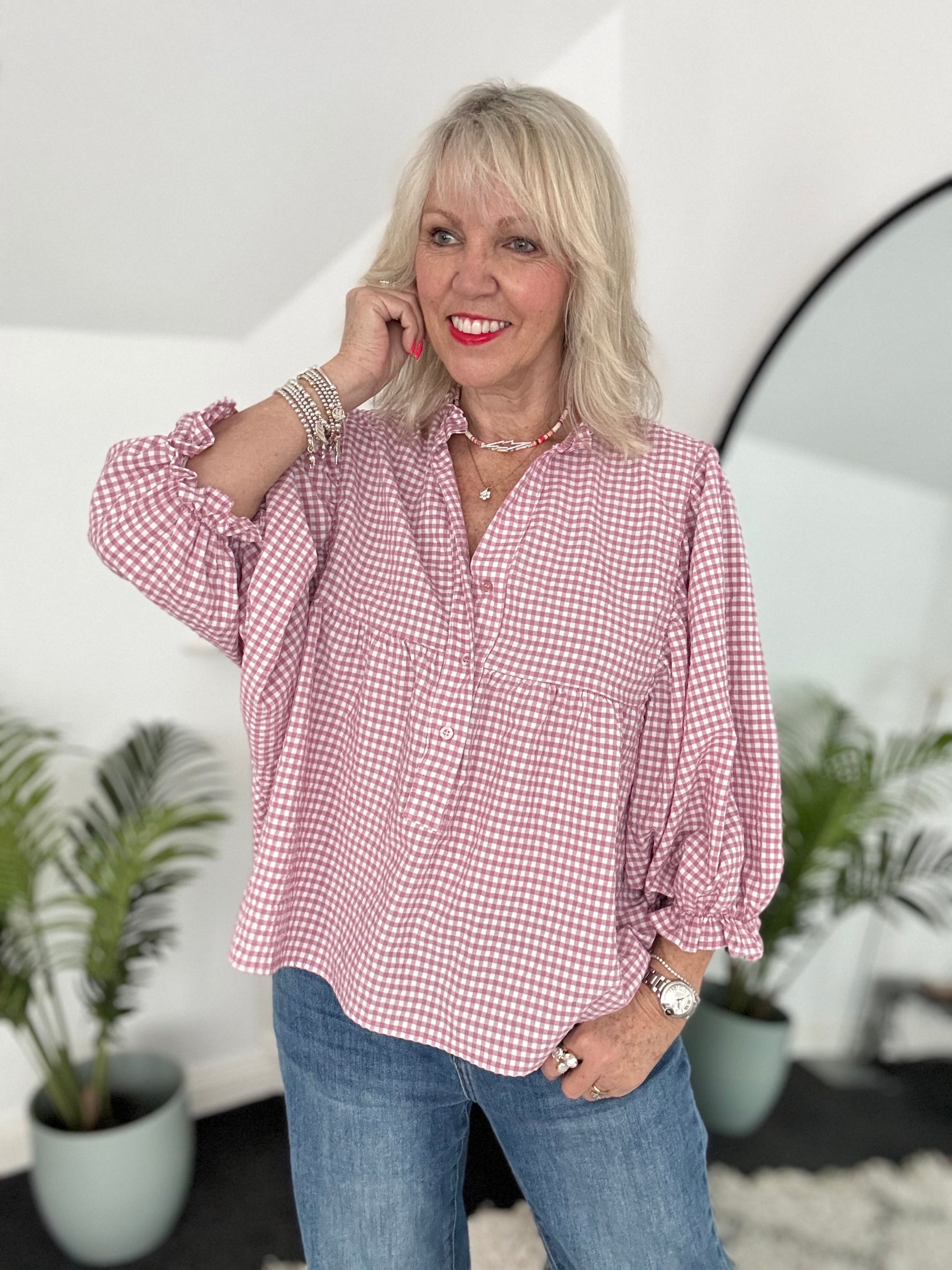 Gingham Seersucker Blouse in Rose Pink