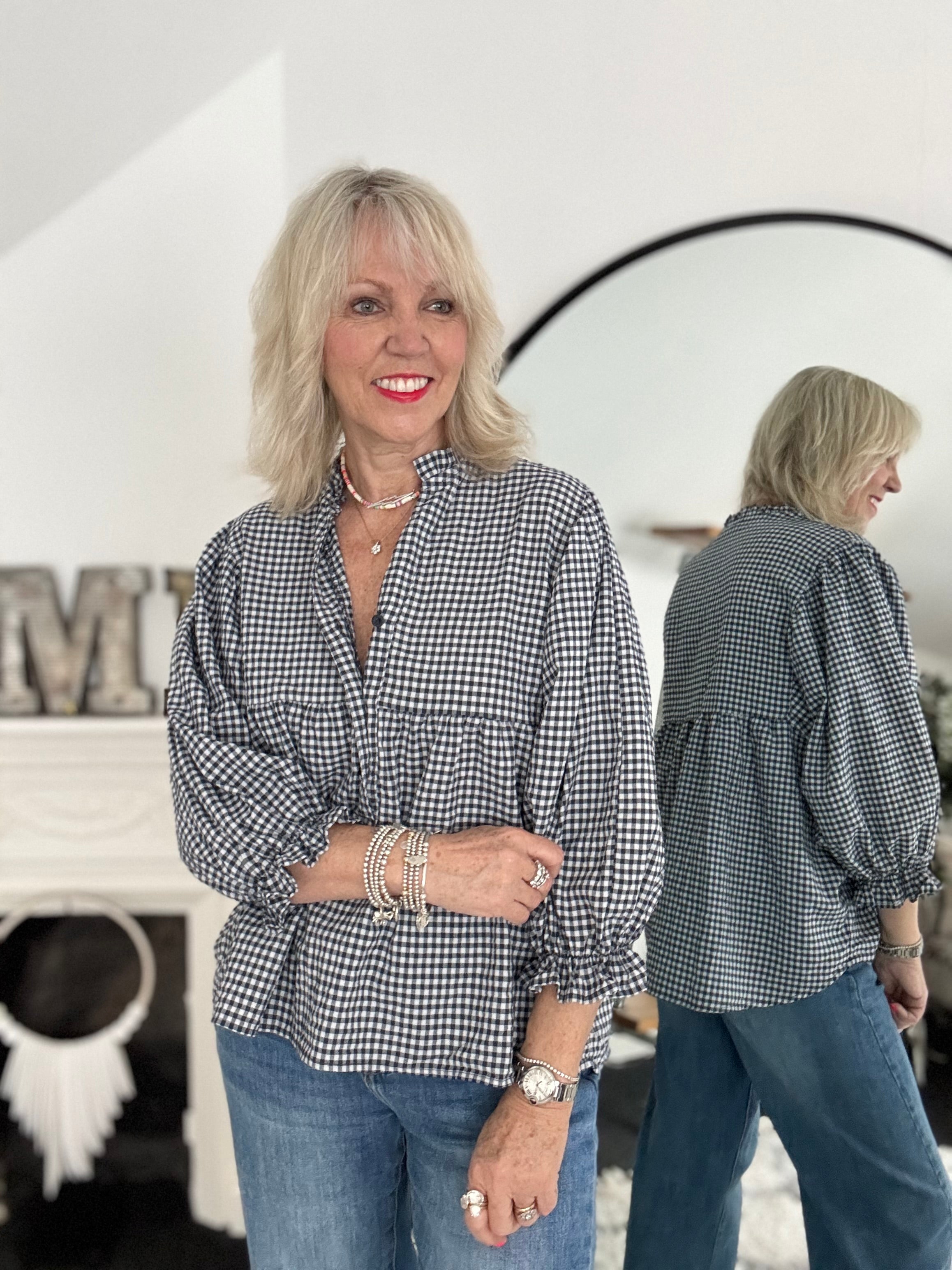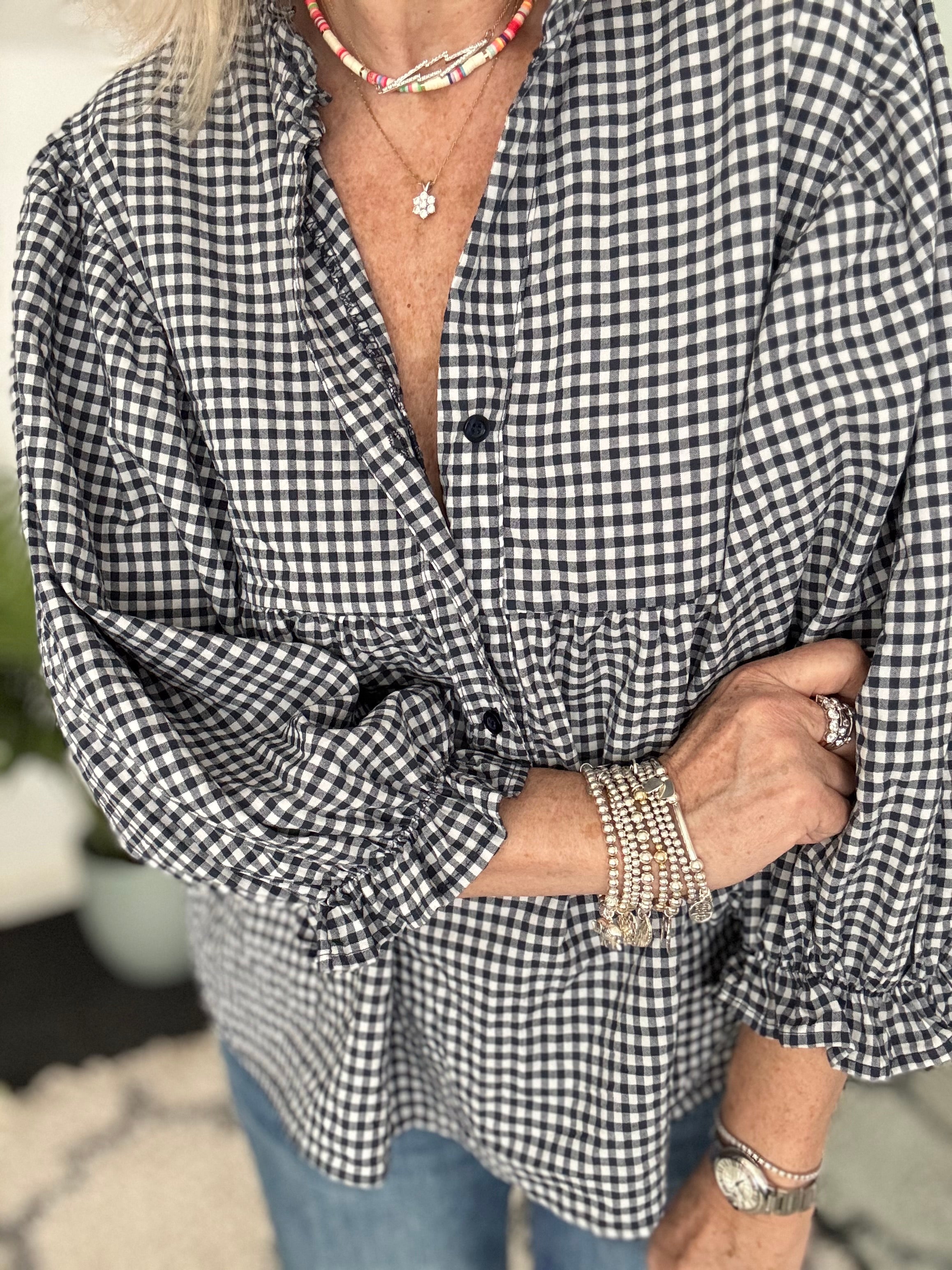 Gingham Seersucker Blouse in Navy