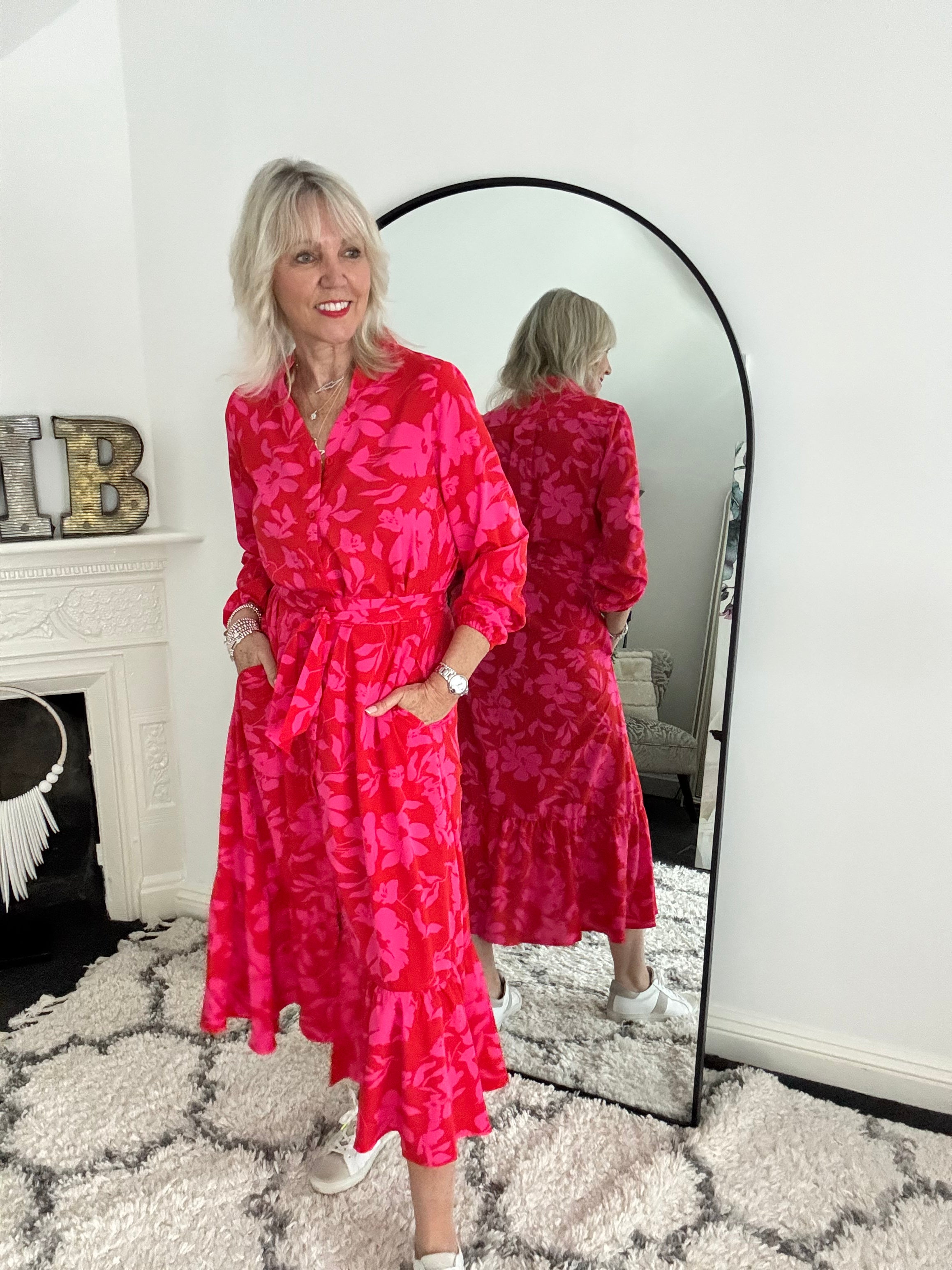 Premium Tropical Print Dress in Red & Pink