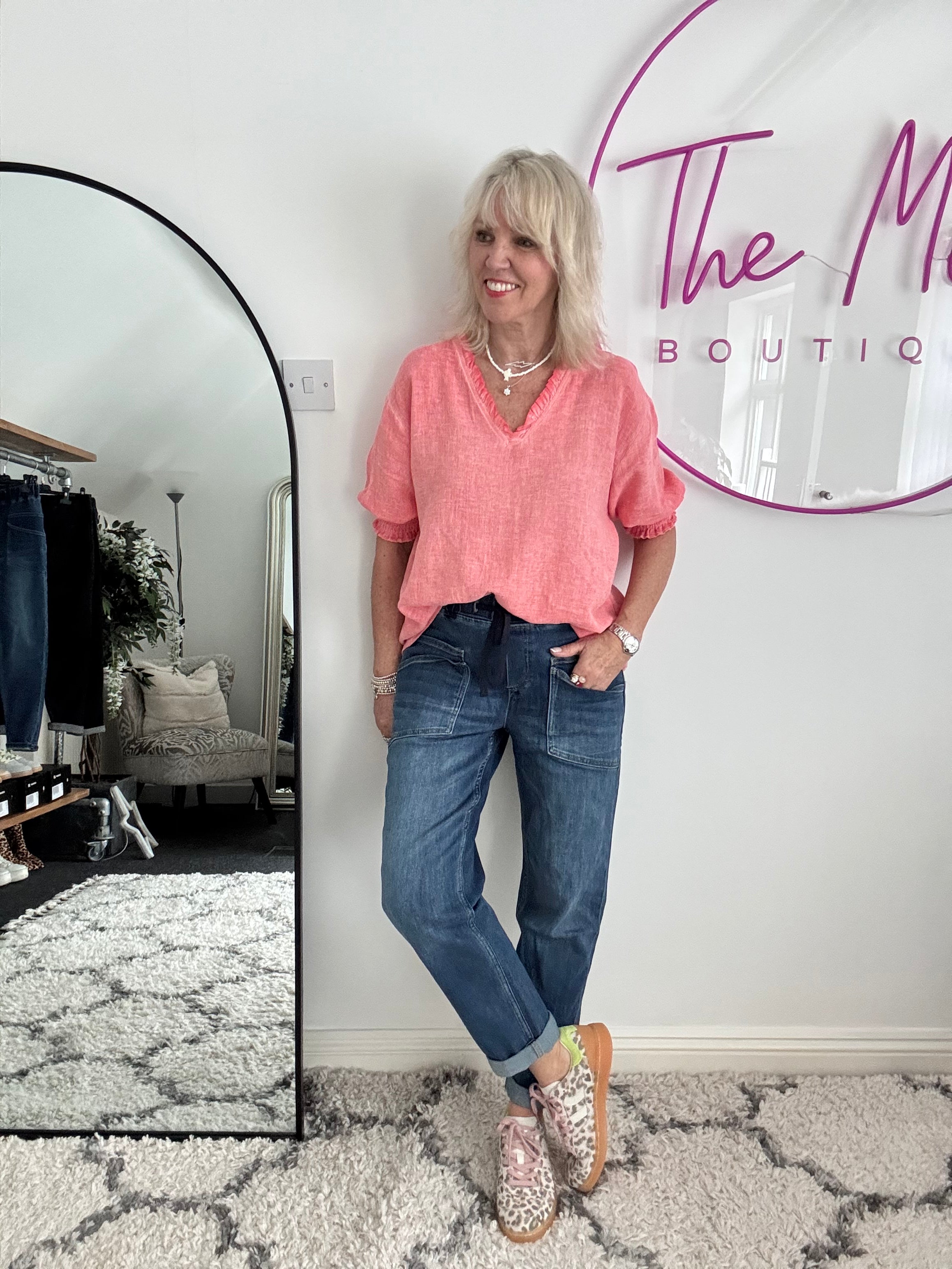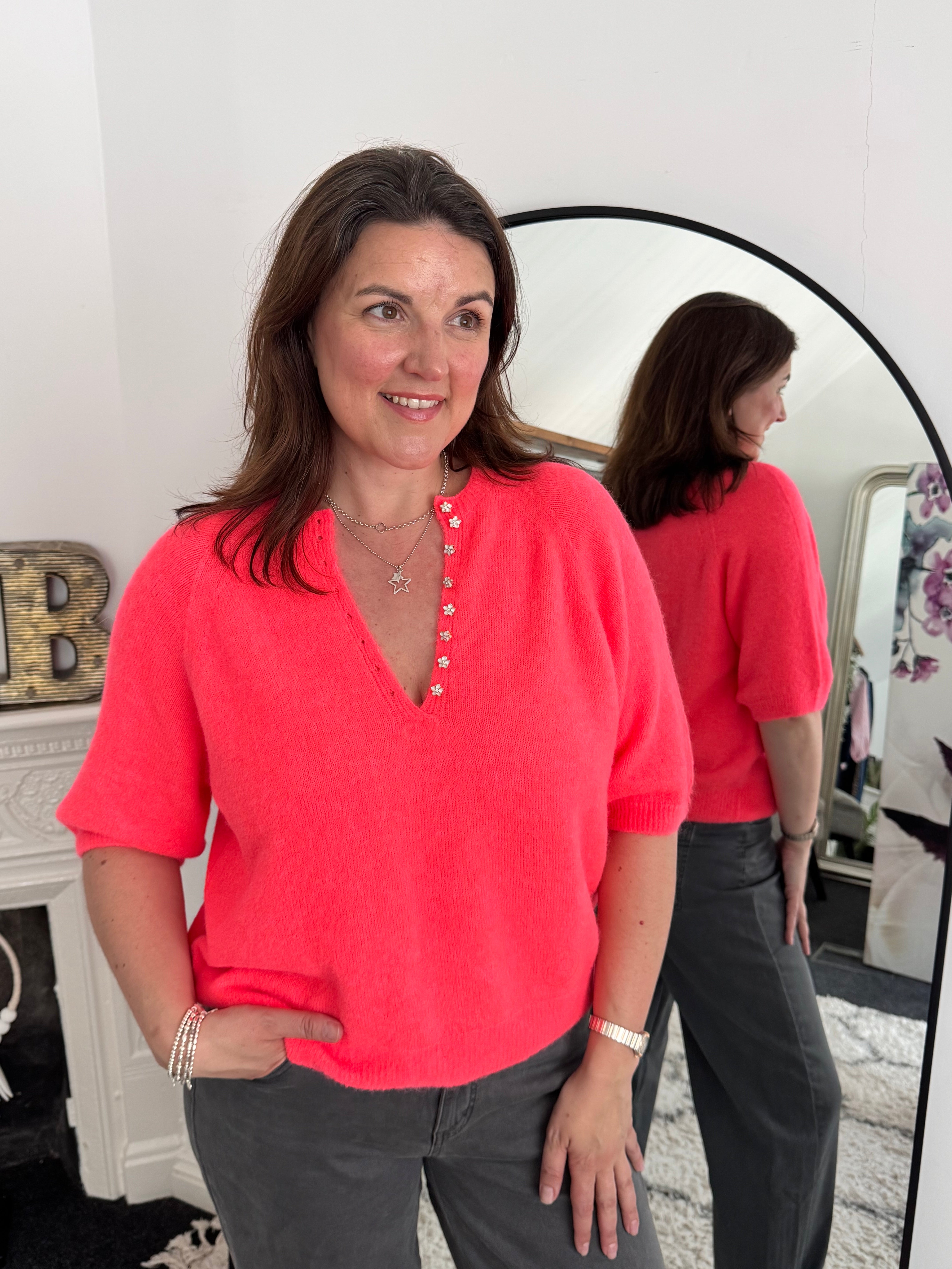 Flower Button Neck Alpaca Jumper in Neon Coral