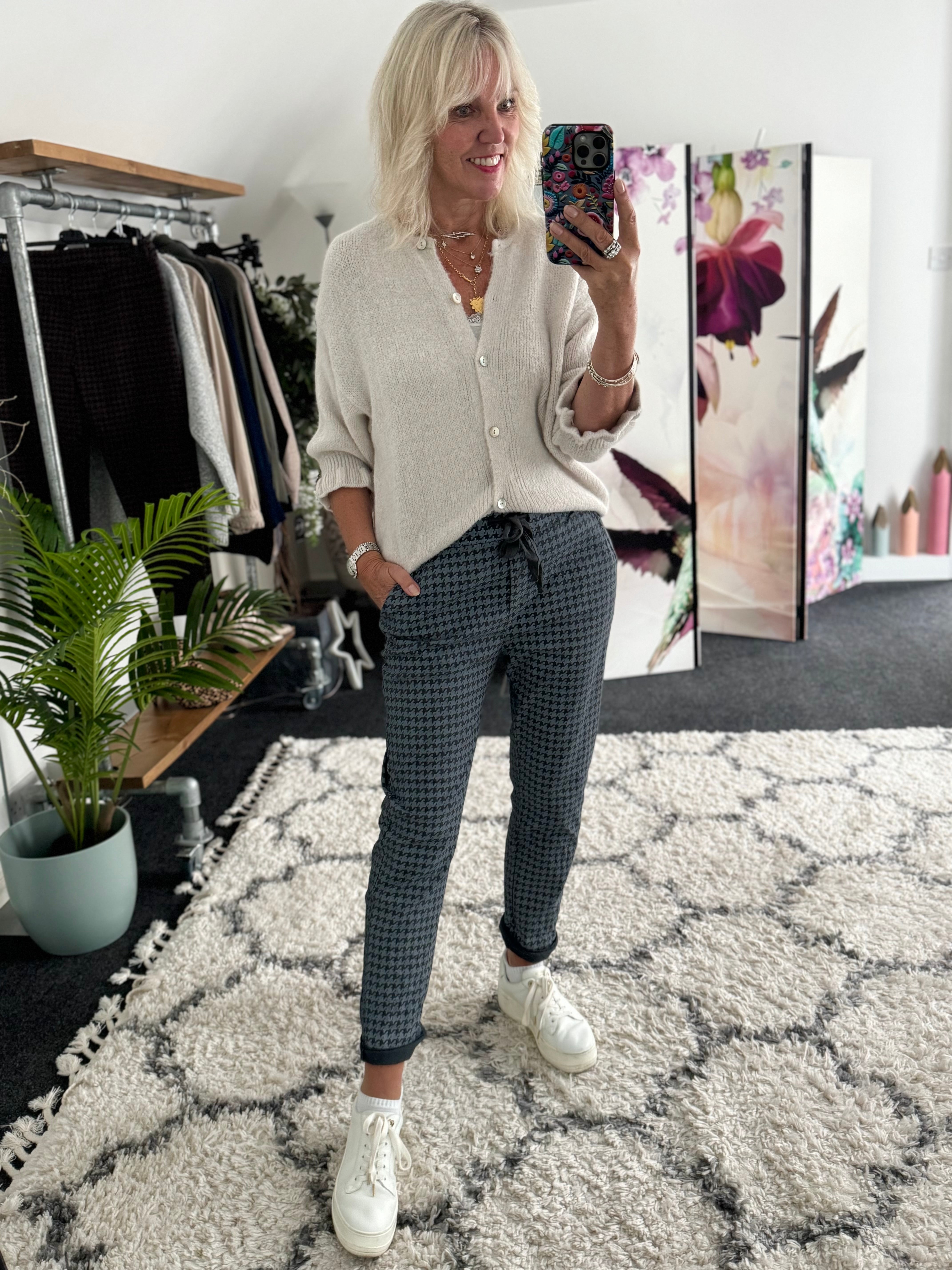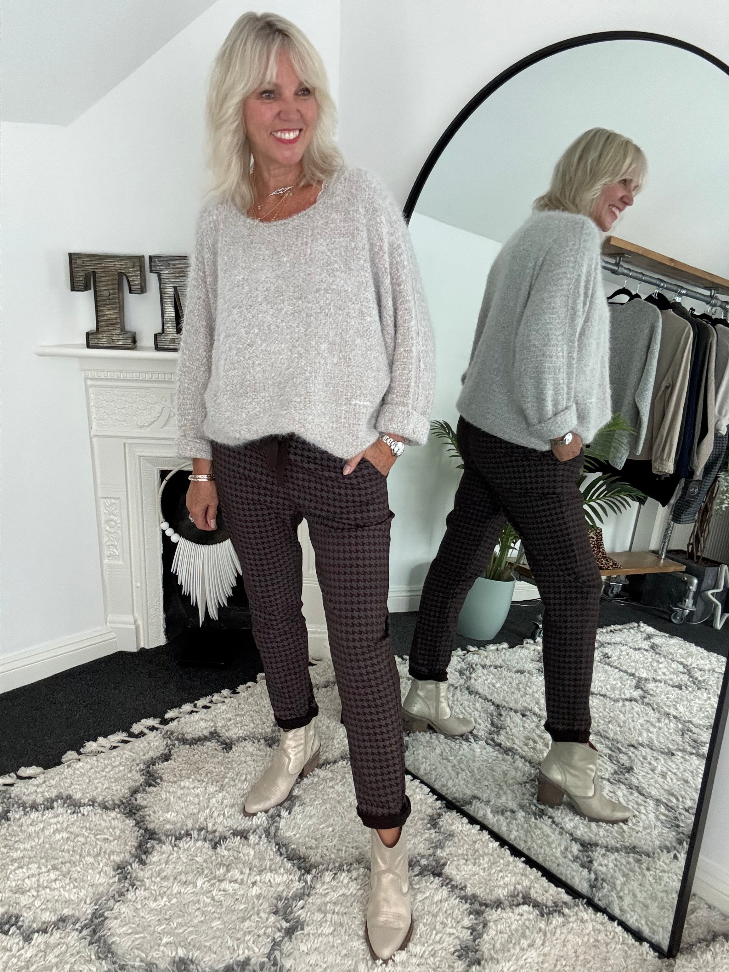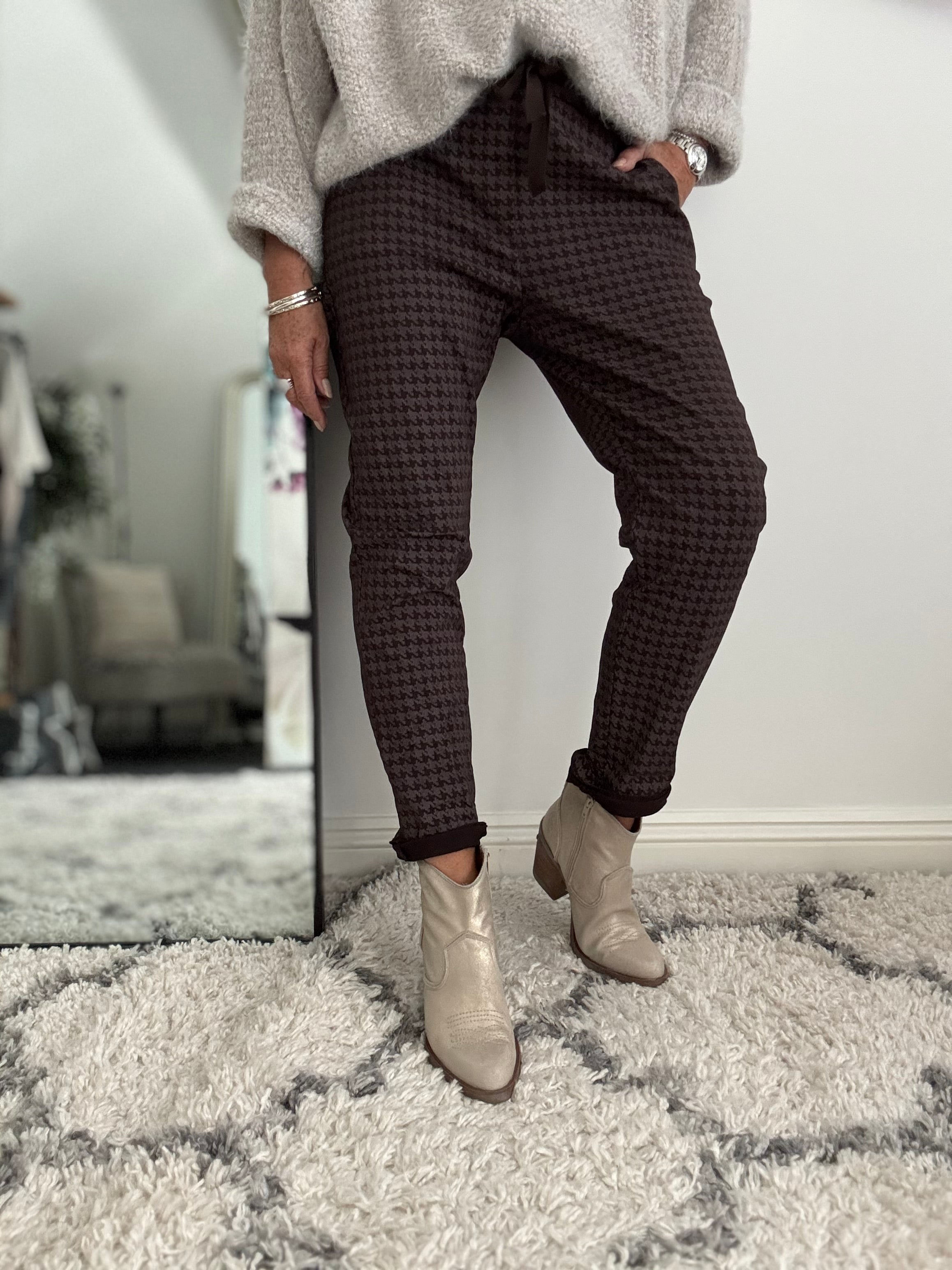Stretch Dog Tooth Joggers in Soft Chocolate