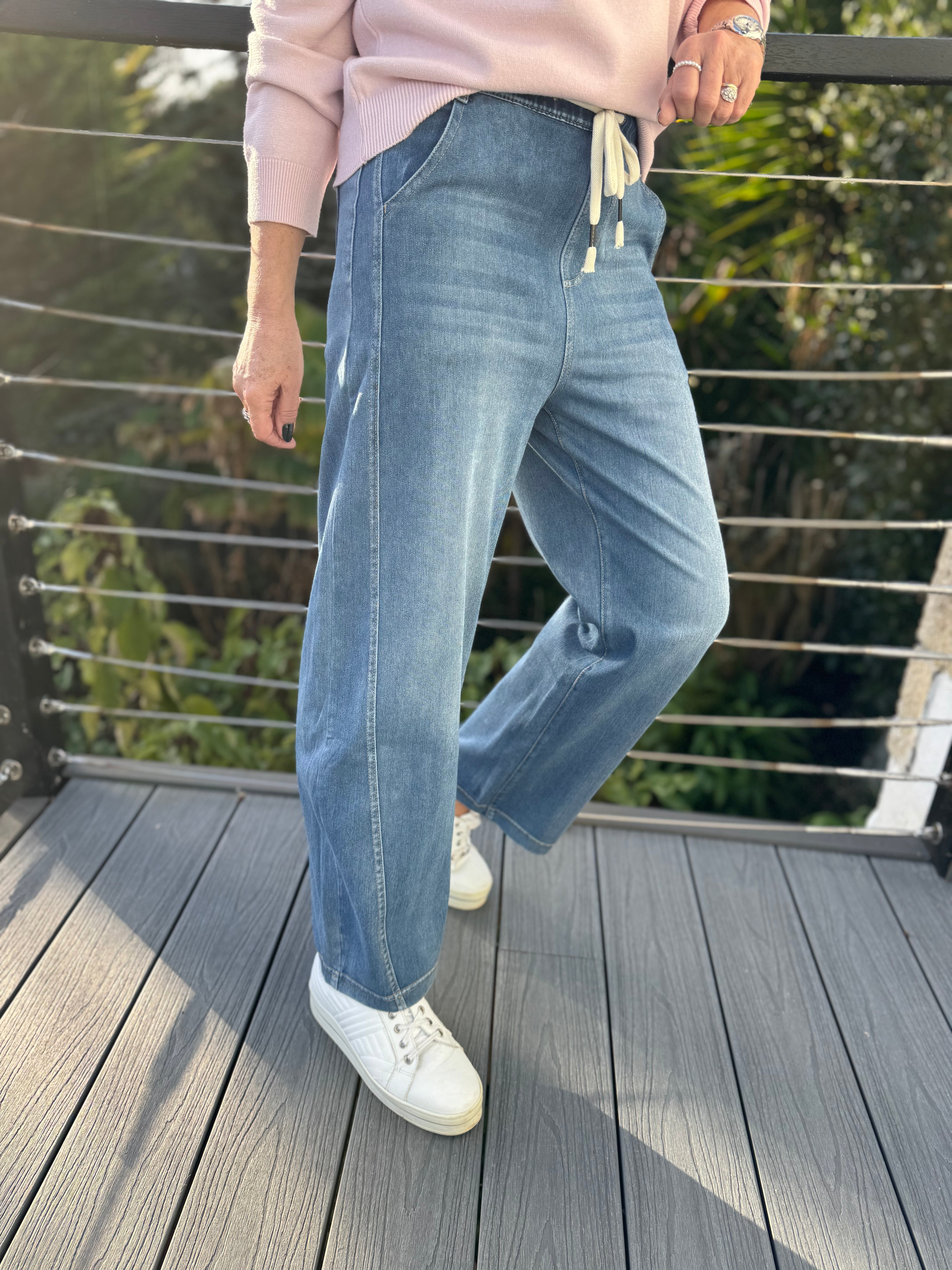 Stretch Barrel Leg Joggers in Mid Denim